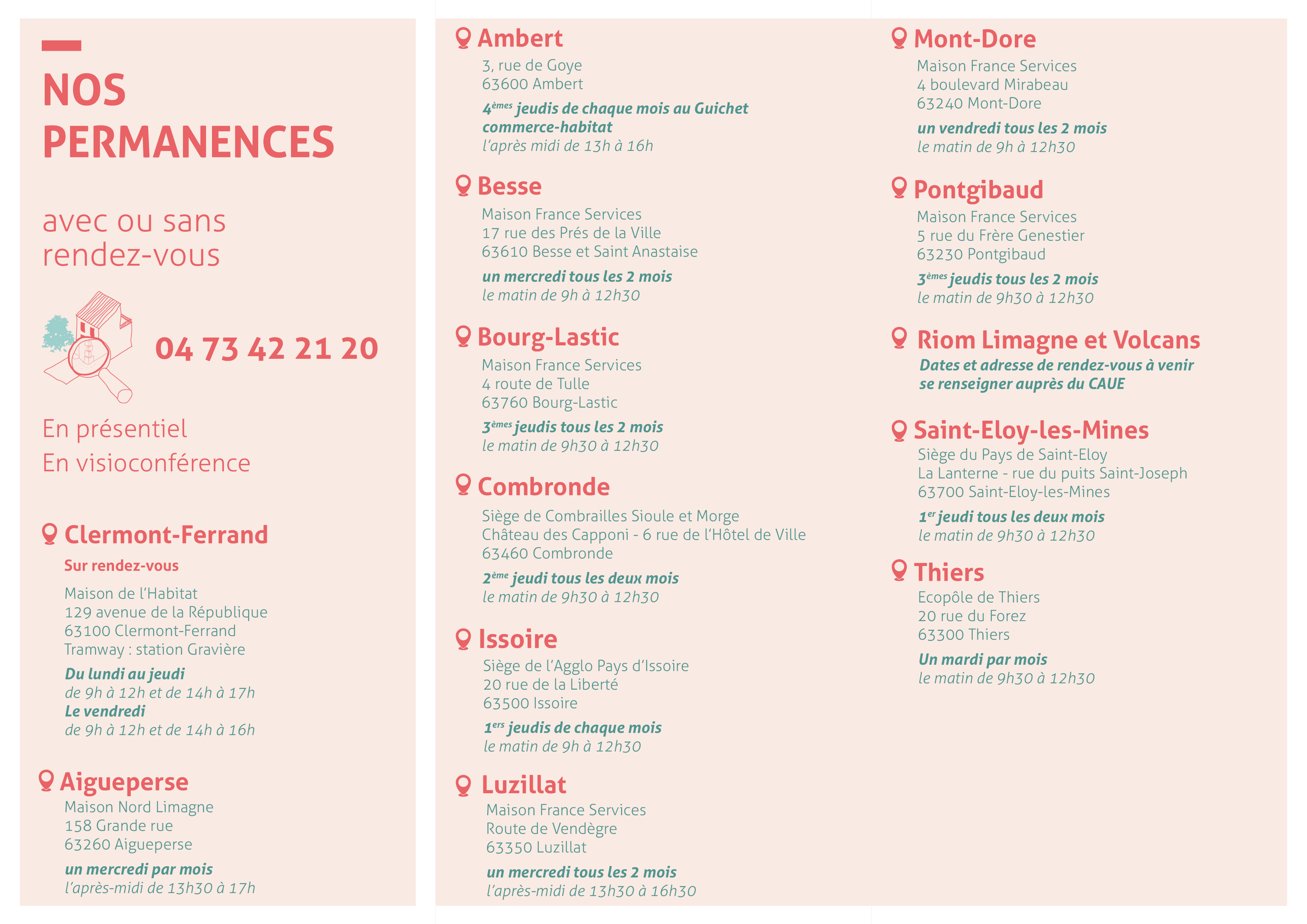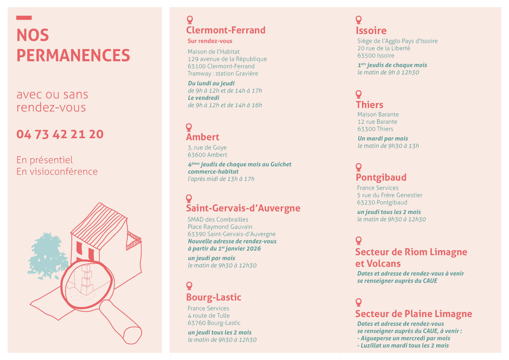 Nous assurons des permanences de conseils du lundi au vendredi à la Maison de l'habitat (Clermont-Ferrand) et sur divers territoires du Puy-de-Dôme.